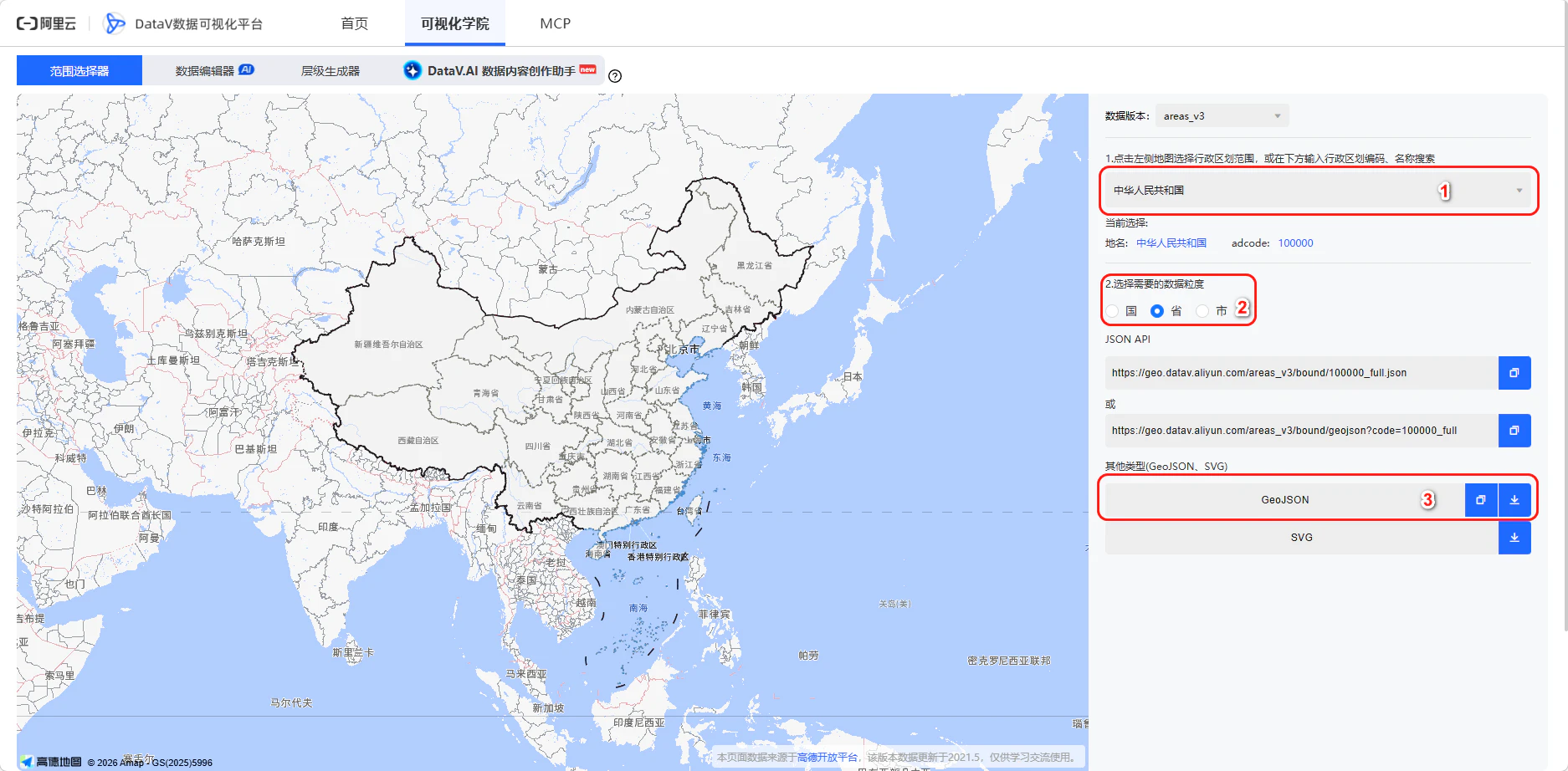 首先需要获取中国省份的GeoJSON地理信息数据。推荐使用阿里云DataV提供的县级选择器工具: